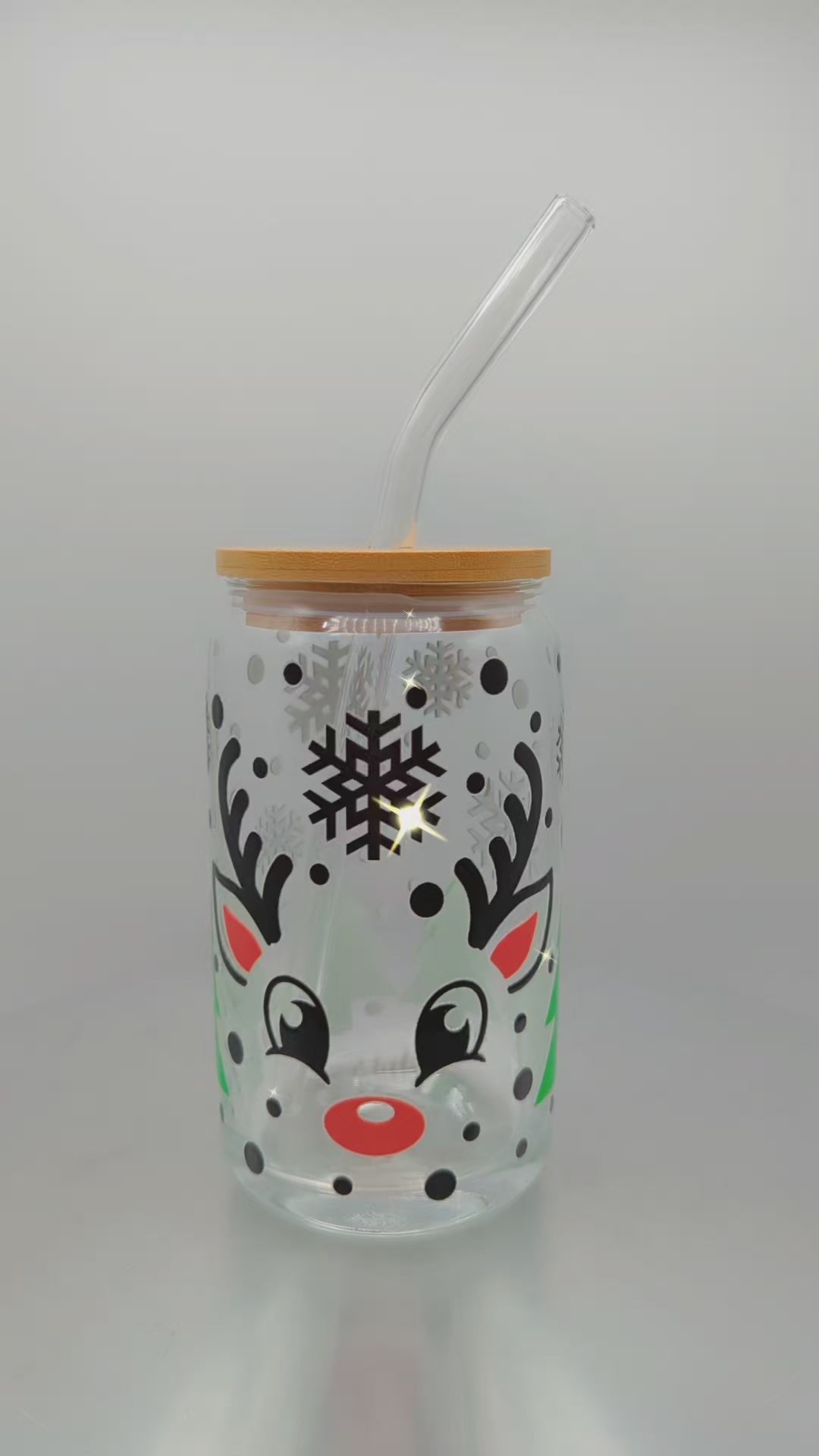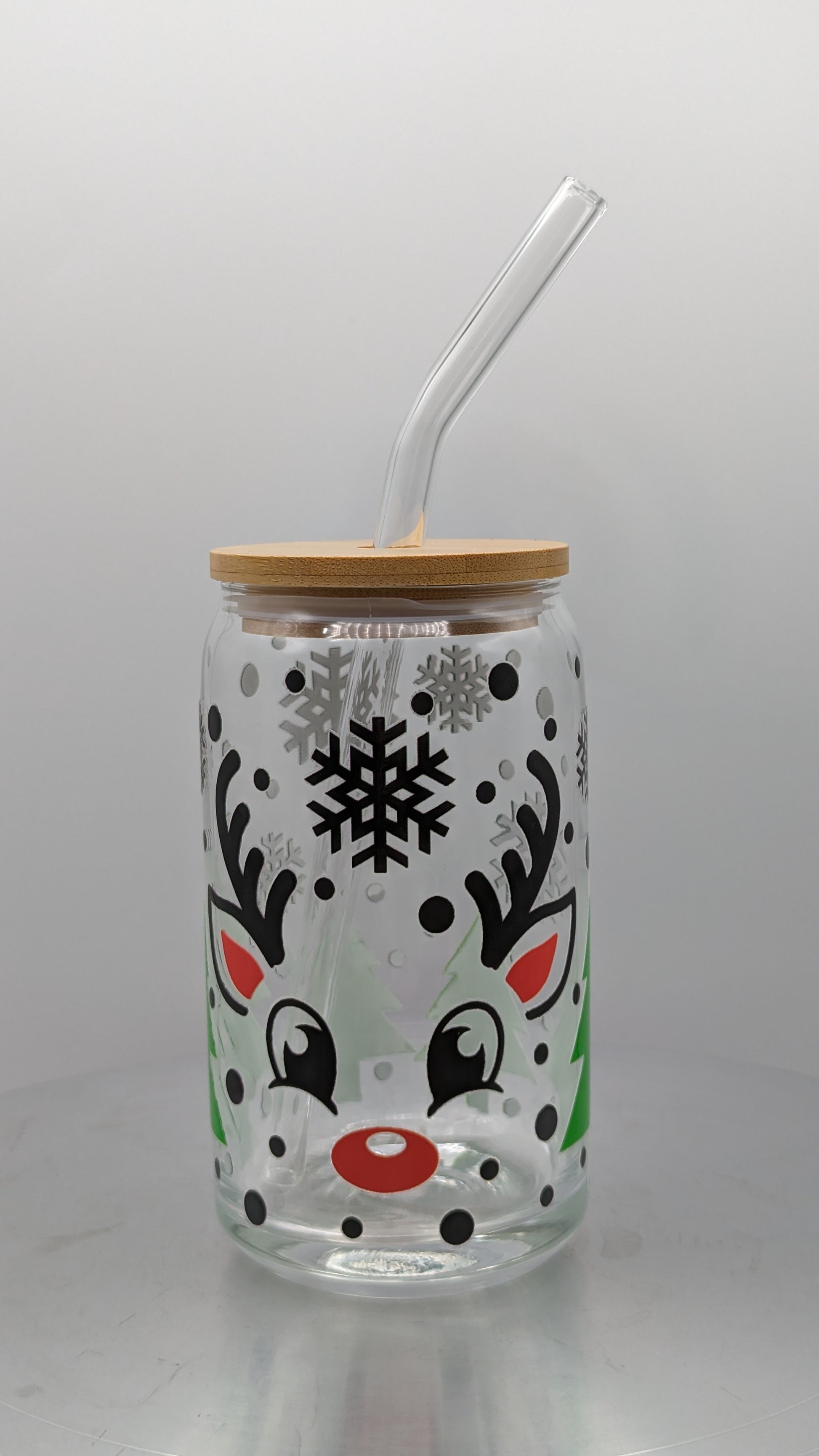 Drinking 16oz Beer Can Shaped Glass with Bamboo Lid and glass straw. Also comes with a straw cleaning brush.